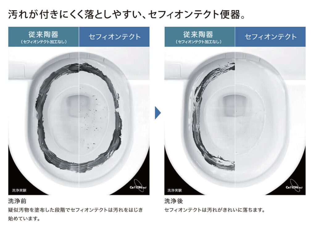 セフィオンテクトTOTO独自の技術で、陶器表面の凸凹をナノレベルでなめらかにしているので、汚れが付きにくく落ちやすい!