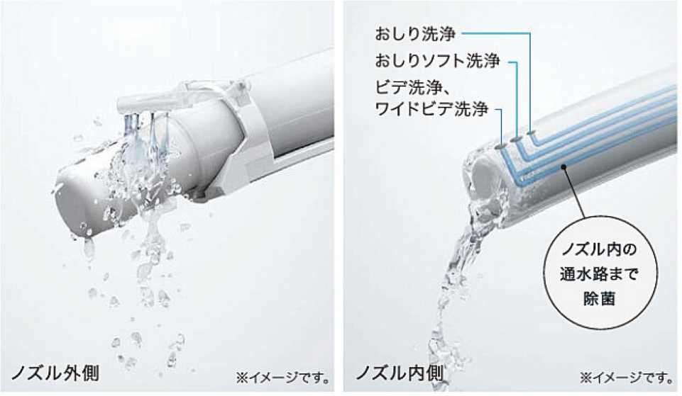 ノズルきれいトイレ使用後に「きれい除菌水」でノズルの内側も外側も自動で洗浄・除菌してくれます。さらに8時間使用していない場合も定期的に洗浄してくれるから、安心してご使用できます!