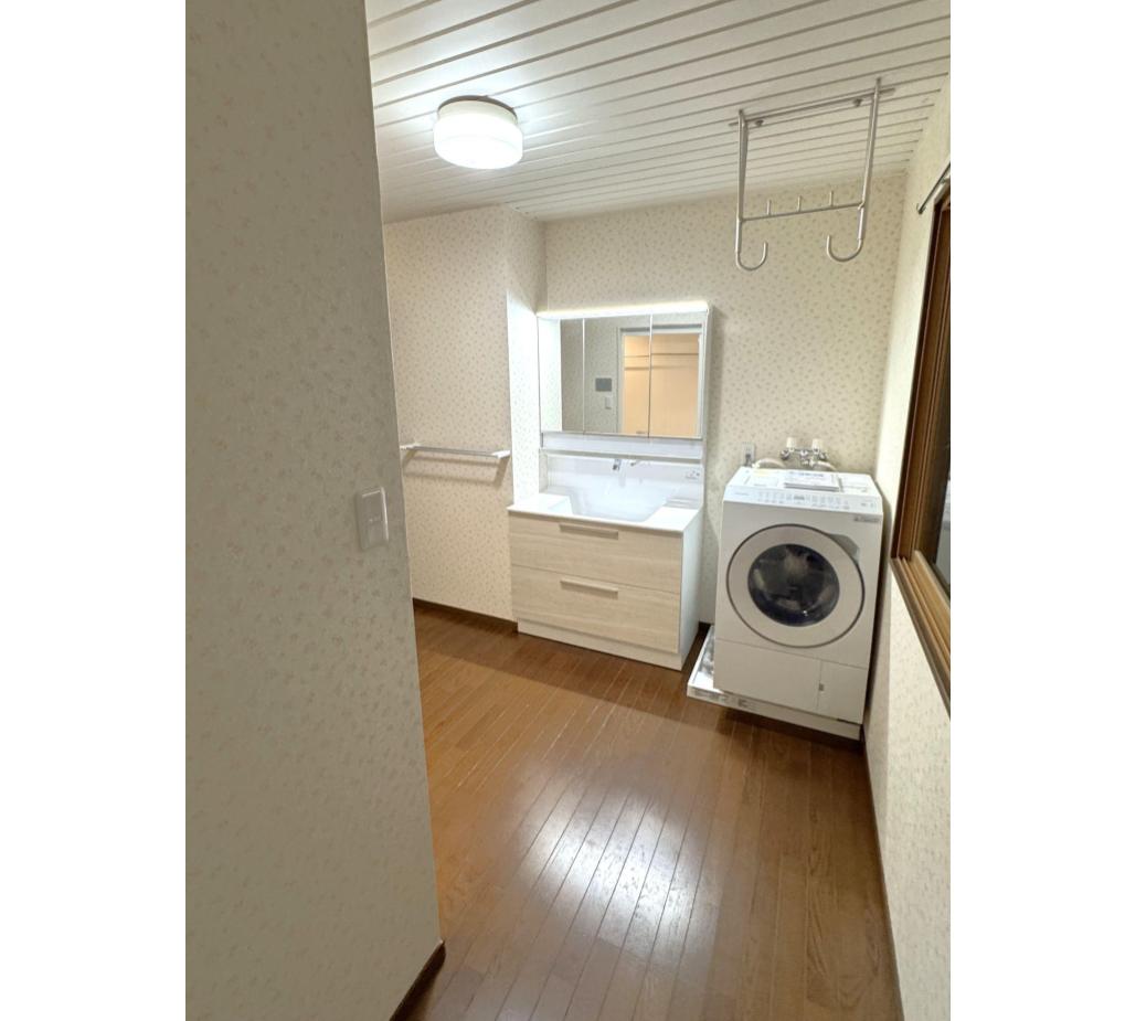 また、リフォームに合わせて脱衣所のクロスも貼り替え、換気扇も交換。動線を考慮して洗濯機の配置も変更しました。
